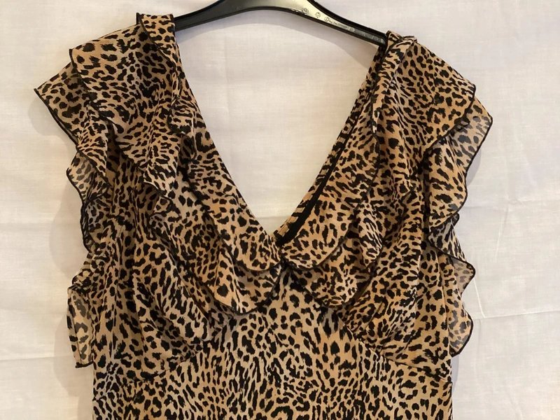 This New Look chiffon animal print midi dress with ruffled neckline and full lining offers a playful yet elegant look. Ideal for casual outings or evening events.
