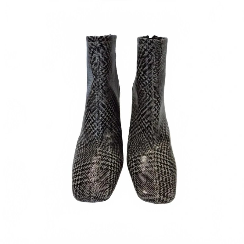 Crafted from a check print faux leather upper, these stylish boots are designed for all-day wear. They feature a 3.25 inch block heel, lightly padded insole for comfort, and a back zip for easy foot access.