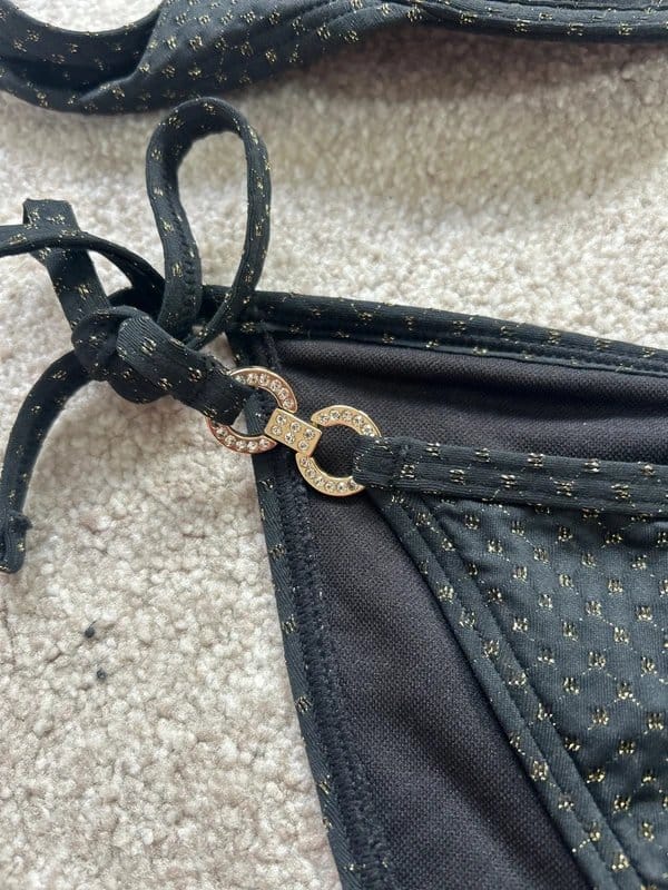Stunning sparkly black and gold bikini with a plunge halter neck design. Excellent condition, offering great lift and support.
