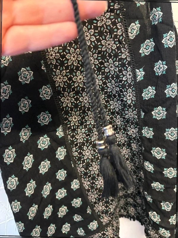 The New Look Black Boho Flowy Print Tassel Cami Top is available in sizes S.