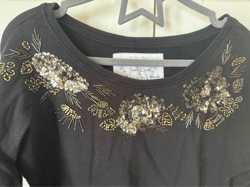 This is a black sweatshirt from New Look. It has embellishment under the neckline with beads and sequins. Perfect for casual wear.