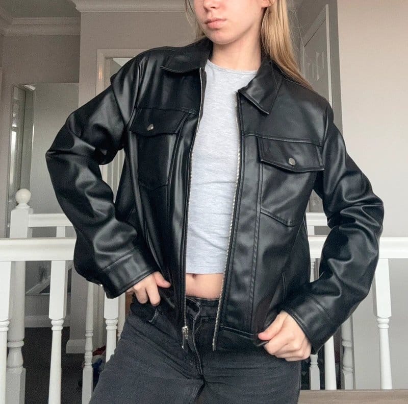 See all outfit ideasMinimal design black faux leather jacket with a zip-up front and two front pockets. Features a structured collar and an oversized fit. Perfect for everyday wear and easy to style.