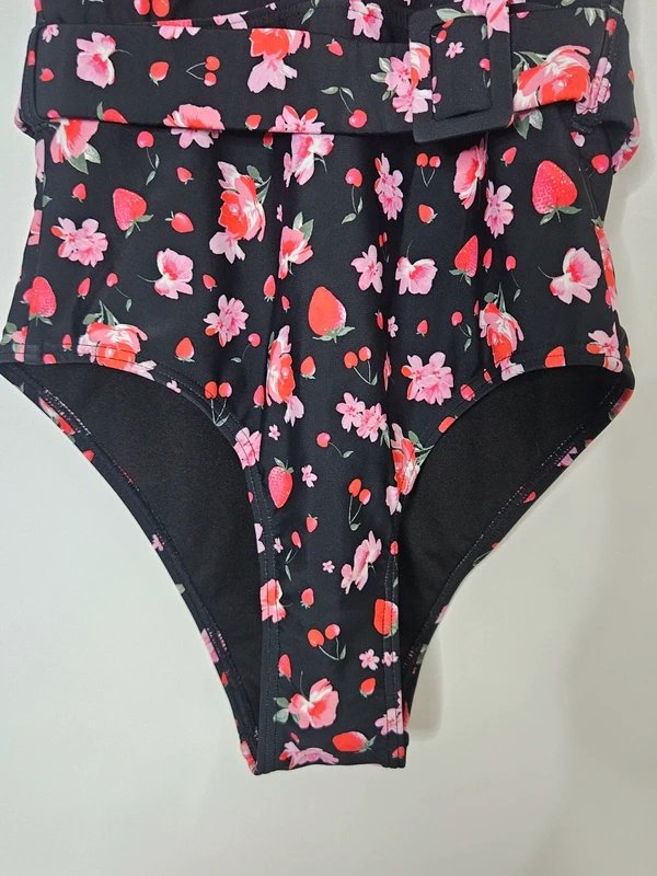 Black Floral Halter Swimsuit — the perfect swimwear for beach days and pool parties. Designed with a vibrant all-over print of pink flowers, strawberries, and cherries on a black background, this plunging V-neckline swimsuit features a tie-halter neck and a matching belted waist. Crafted from lightweight stretchy fabric for a comfortable and flattering fit. Ideal for sunny days by the pool or at the beach.