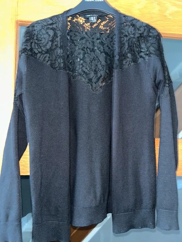 Stylish black lace cardigan from New Look. Features intricate lace detailing on the front and sleeves, adding a touch of elegance. Perfect for layering over your favourite tops.