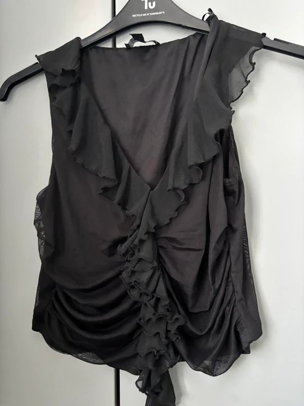 New Look Black Ruched Top - a versatile piece for any wardrobe. This sleeveless top features a ruched design, adding a touch of drama and elegance. Crafted from lightweight, sheer fabric, it offers a modern and chic look. Perfect for layering or wearing on its own, this top is a must-have for any fashion-forward individual.