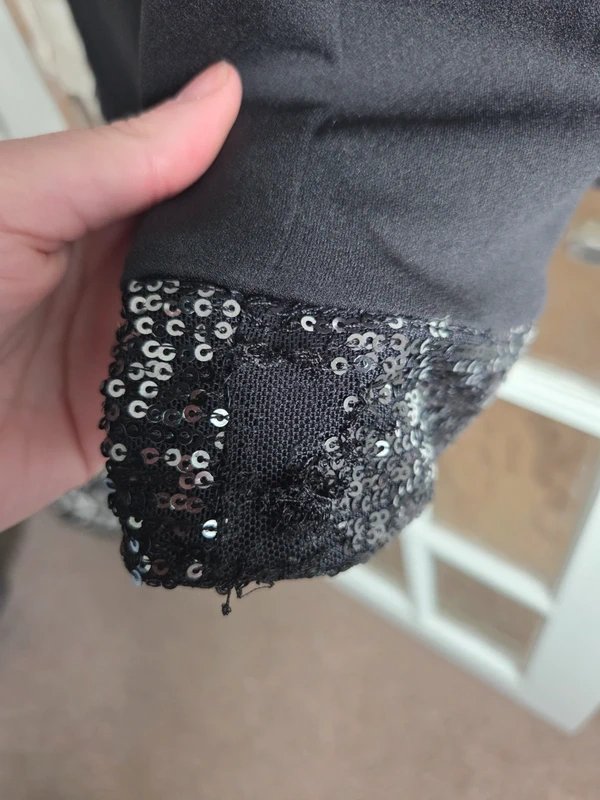 New Look black shift dress with sequin embellished collar and cuff detailing, UK size 14. Elegant and flattering style featuring sheer long sleeves and subtle sequin detail on the collar, cuffs and hem. Perfect for evening wear or special occasions.