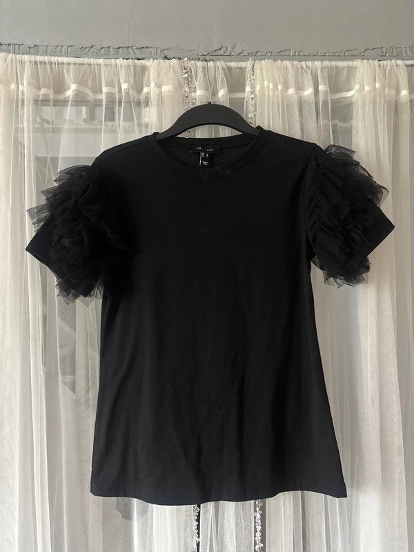 The New Look Black T-shirt with Tulle Sleeves is available in sizes S.