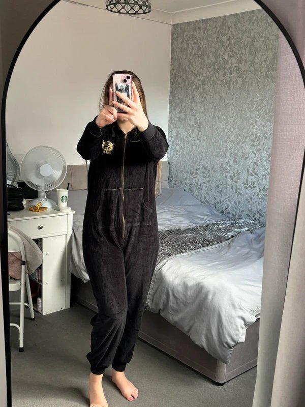 Crafted with velvet material, this black and gold onesie features a drawstring hood, cuffed sleeves and bottoms, and a front zip with side pockets. It fits a size M, offering a comfortable and stylish loungewear option.