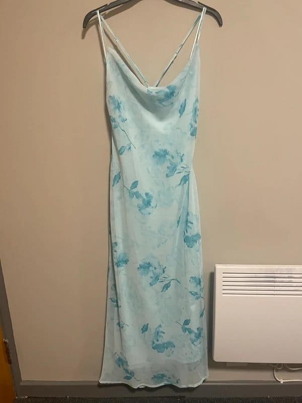 The New Look Light Blue Floral Dress is available in sizes M.