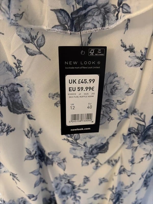 The New Look Blue Floral Ruffle Asymmetric Midi Dress – UK 12 is available in sizes M.