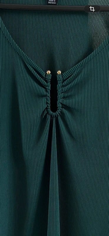 Stylish New Look dark green ribbed bodysuit with a flattering fit. Features a gold metal U-bar at the bust for added support and a sheer back for a touch of allure. Perfect for layering or wearing on its own.