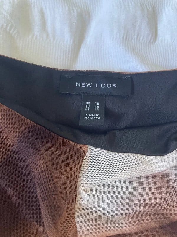View Vinted's returns policyTrendy long-sleeved mesh top from New Look featuring a brown and cream abstract print. The ruched detailing adds a stylish touch, perfect for a casual yet chic look.