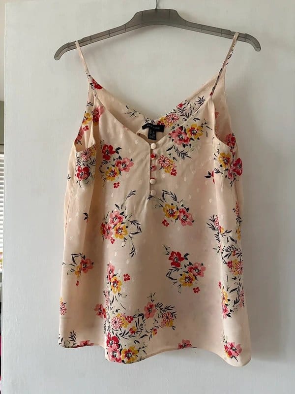 Charming New Look cami top in apricot with a floral print. Features a button front and straps for adjustable fit. Perfect for a casual look.