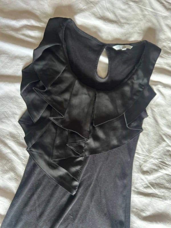 This New Look cami top in black satin features a keyhole back and ruffles in the front. Soft and comfy, it's perfect for layering or wearing on its own.