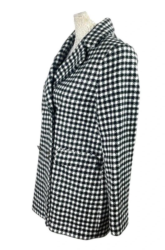 Get ready to turn heads with this stunning black and white gingham overcoat from New Look. This mid-length coat is perfect for any occasion, whether you're heading to a party, a formal event or a business meeting. The coat is made from soft shell fabric similar to brushed cotton and features a button closure, long sleeves, and a collared neckline.