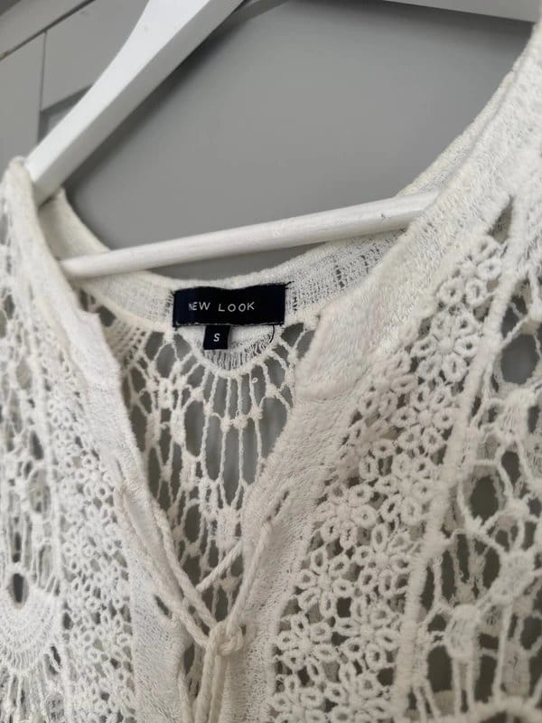 Delicate white crochet beach dress by New Look. Features an airy, lace-like texture and a relaxed fit. Ideal for beach outings or casual summer wear.