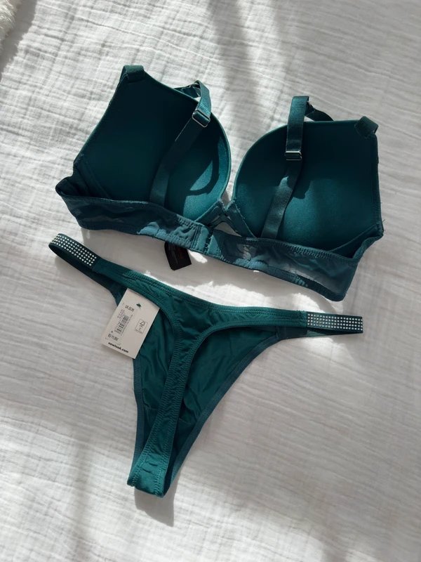New Look dark green, diamanté strap push up plunge bra and matching thong set. Brand new, with tags. Bra size 34B and thongs size 8.