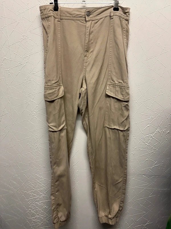Beige cargo joggers with a high waist, button fastening, cargo pockets, and elasticated cuffs. Crafted from comfortable utility fabric, perfect for everyday wear.