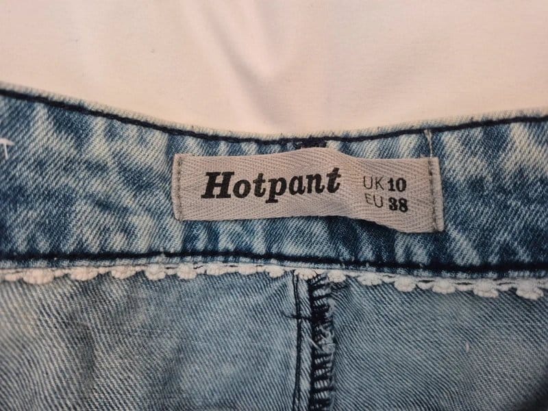 Stylish light blue denim hotpants by New Look. Featuring a classic denim texture with a slightly faded wash, these shorts are perfect for casual wear. The waistband has a label indicating size UK 10 and EU 38. Adorned with decorative white stitches along the hem for added detail.
