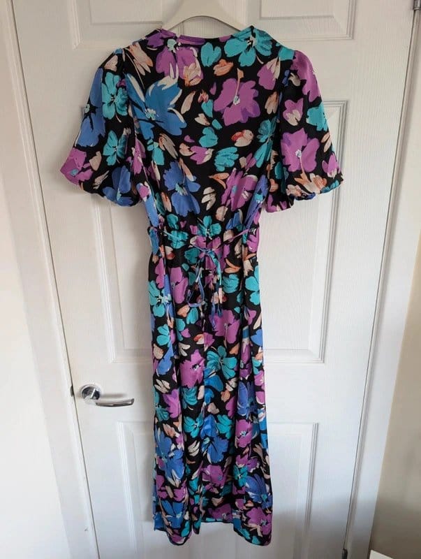 Vibrant floral midi dress by New Look featuring a V-neckline, tie-back detail, and puff sleeves. Perfect for casual outings or garden parties.