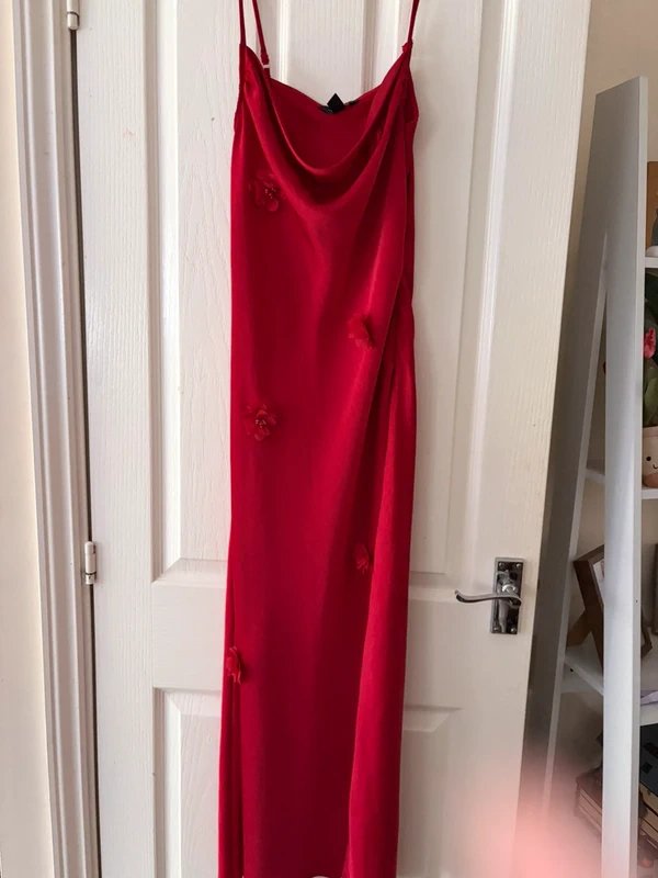 Beautiful red long maxi length dress adorned with delicate flowers. Ideal for special occasions, this satin dress adds a touch of elegance to your wardrobe.