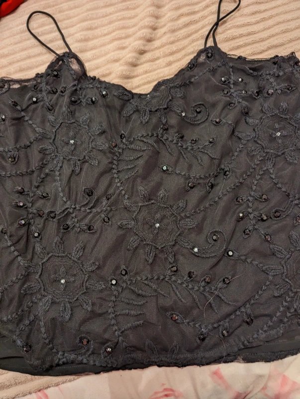 A black embellished camisole top by New Look, embellished with sequins and diamonds. The waist length top features shoe string straps and can be worn alone or under a jacket.