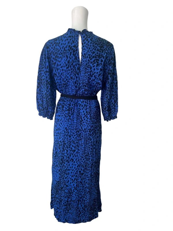 A stunning blue leopard print midi dress with a high belt and flared fit. Perfect for making a bold statement at any occasion.