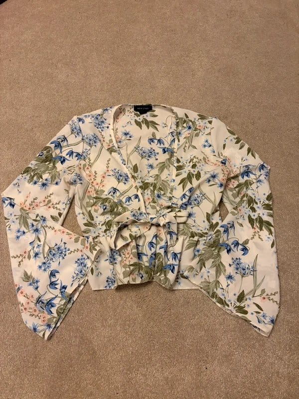 Charming cream floral blouse from New Look in a UK size 8. This top features a vibrant blue and pink botanical print with green foliage. It has a flattering fit with flare/bell sleeves for a boho feel and a tie-front detail to cinch the waist.