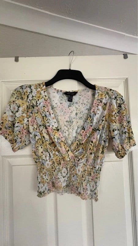 View Vinted's returns policyPlayful multi-floral crop top from New Look featuring a V-neckline and gathered waist. Made from lightweight fabric with a bohemian vibe, perfect for casual outings.