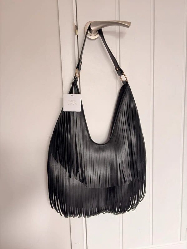 Elegant black faux leather shoulder bag with a fringed design. Features a small zip pocket inside for added convenience. Perfect for everyday use.