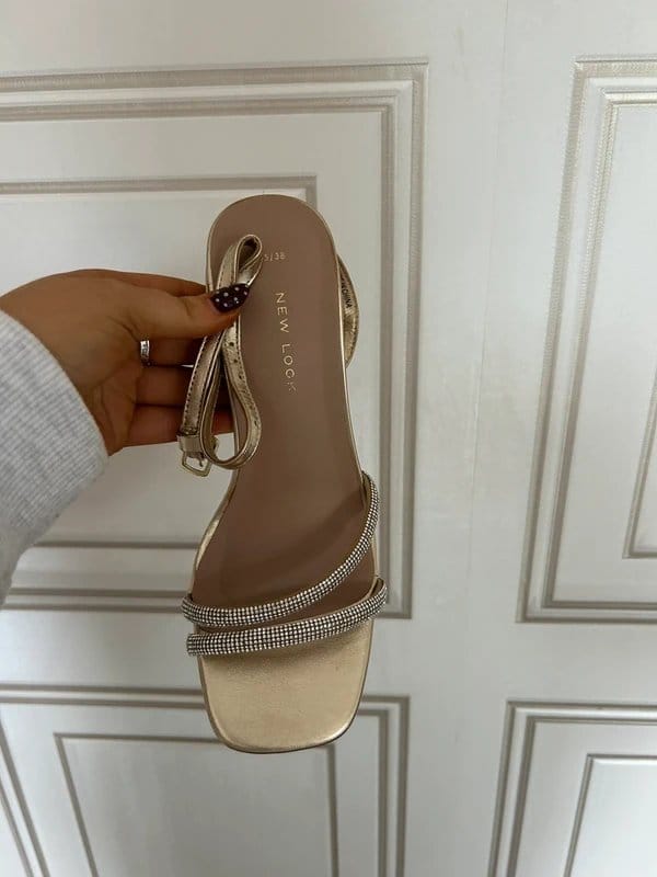 Elegant New Look gold strappy block heel sandals adorned with diamanté embellishments. Perfect for adding a touch of glamour to any outfit.