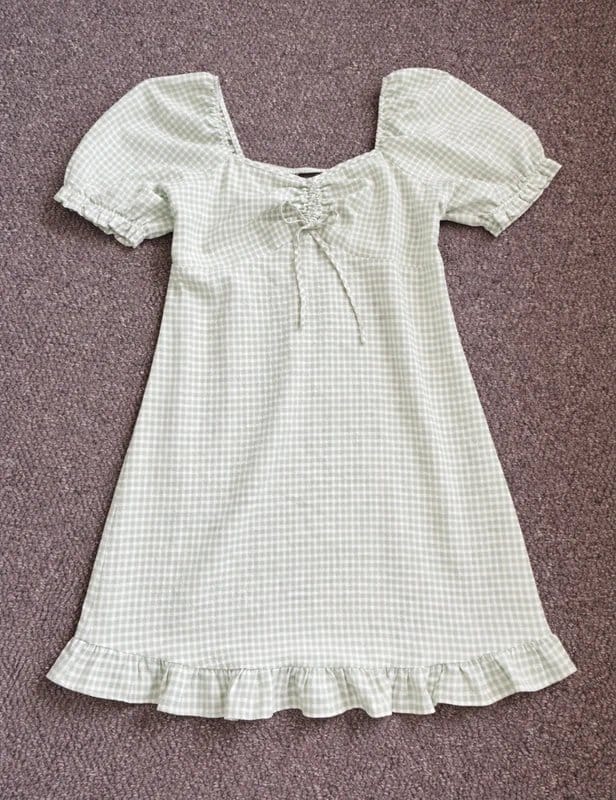 Charming sage green and white gingham mini dress from New Look. Features a milkmaid-style neckline with a tie detail and puff sleeves. The fringed hem adds a cottagecore touch, perfect for spring/summer and casual everyday wear.