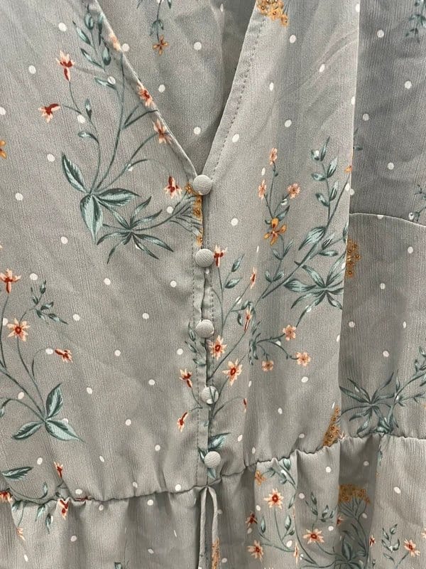 Charming turquoise floral top with a V-neckline and button detail. Features a drawstring waist and polka dot accents. Perfect for casual outings.
