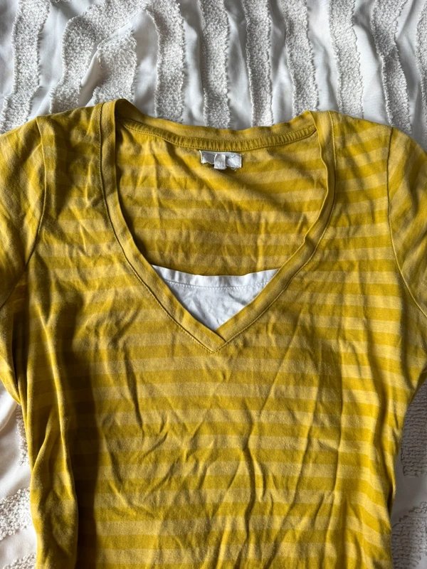Designed in mustard and green stripes, this double-layered tee features a V-neckline and slight ruching on the sides. Perfect for a casual and retro look.