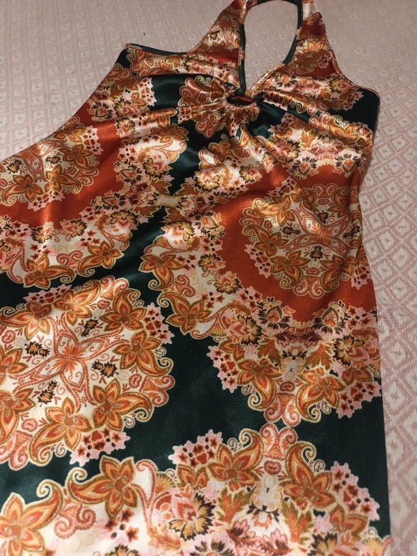 The New Look Halter Neck Bodycon Mini Dress in Orange and Green is ideal for evening, party.