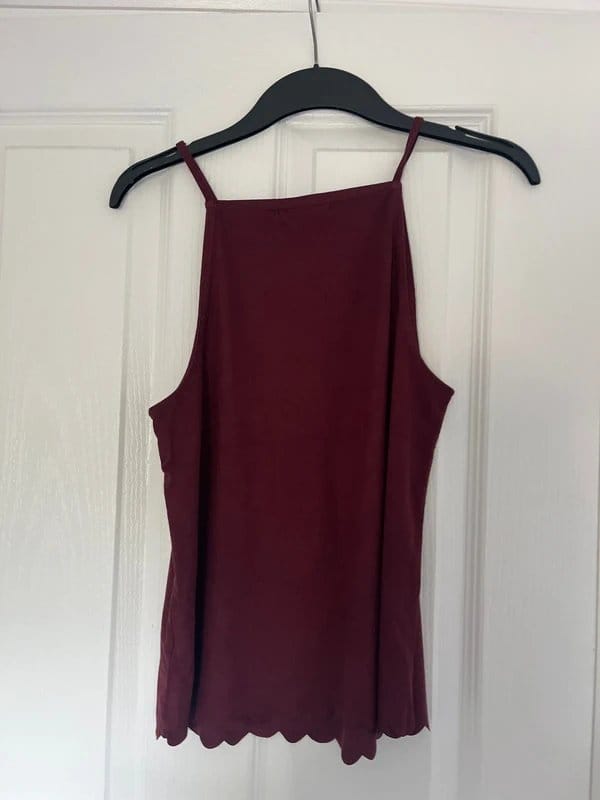 Stylish burgundy velvet halter top by New Look. Features a fitted bodice and a flared hem with a scalloped edge. Perfect for casual or evening wear.