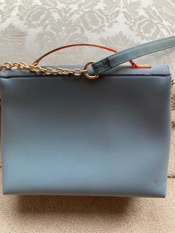 Light blue faux leather handbag from New Look. Perfect for everyday use with its clean, smoke/pet-free condition. Features a sleek design with a gold chain strap and a spacious interior. Ideal for casual outings and special occasions.