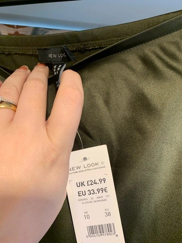 Elegant dark green satin bias maxi skirt from New Look. Features a high waistband and full-length coverage, perfect for spring/summer occasions.