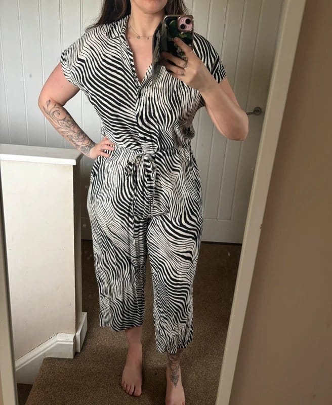 Bold black and white zebra print jumpsuit playsuit from New Look. Features a button-front and tie waist for a flattering fit. Perfect for a casual yet stylish look.