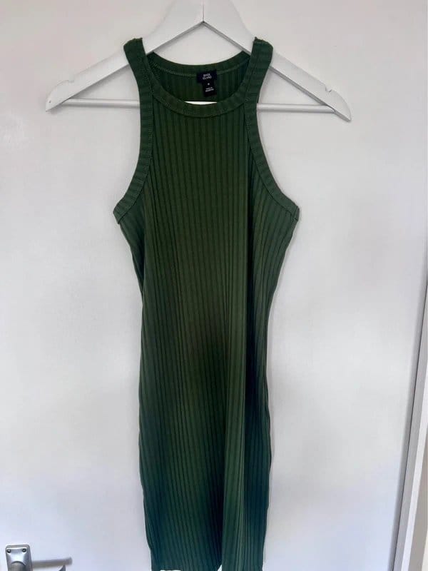 The New Look Khaki Ribbed Halter Dress is available in sizes S.