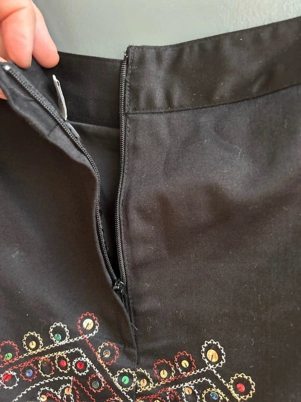 This knee-length skirt from New Look features a zip waist and embellished detailing. The black fabric is lined and has a decorative embroidered pattern in multi-colours.
