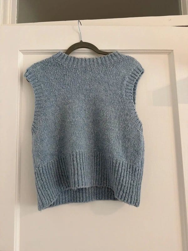Adorable New Look light blue knitted sweater vest. Soft and cozy, perfect for layering over casual outfits. Features a round neckline and ribbed detailing.