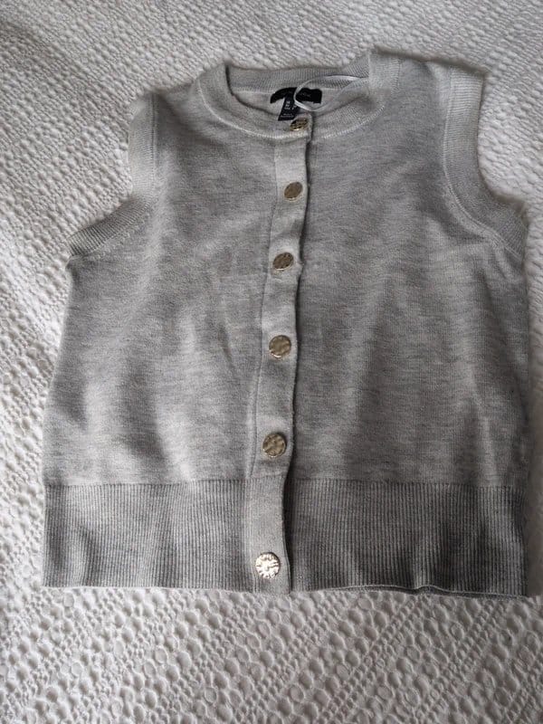 Stylish grey knitted vest by New Look. Made from super soft material with gold hammered buttons for a touch of elegance. Perfect for layering over your favourite tops.
