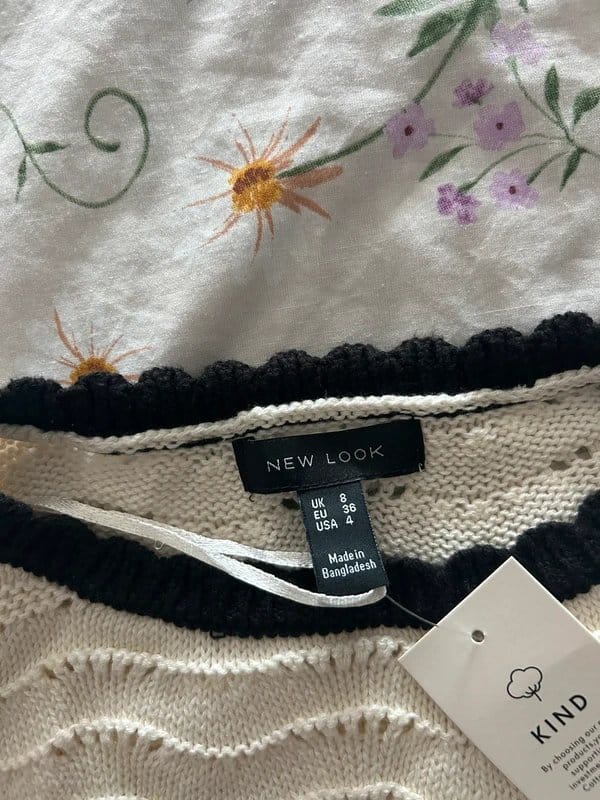 The New Look Cream and Black Knitted Vest Top - Size 8 is made from cotton, polyester.