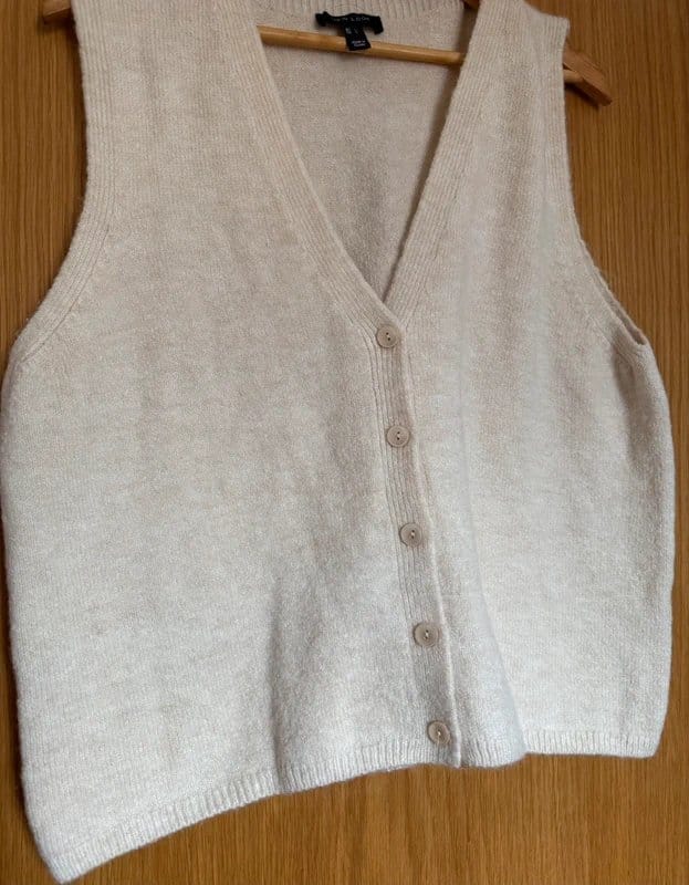 Stylish knitted vest in cream featuring a V-neckline, button-front closure, and ribbed detailing. Perfect for layering over casual outfits.