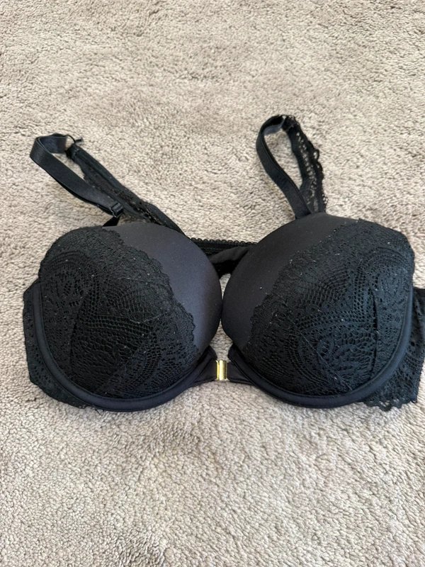 New Look Black Lace Bra - Size 36C. This elegant bra features a lace design with a push-up effect, providing a flattering and supportive fit. Crafted from lightweight lace fabric, it offers a delicate and feminine touch. Perfect for special occasions or as a luxurious addition to your lingerie collection.