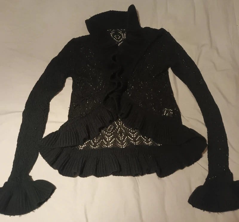 View Vinted's returns policyThis black lace knit cardigan from New Look features a fluffy frilly hem and long sleeves. Perfect for adding a touch of elegance to any outfit.