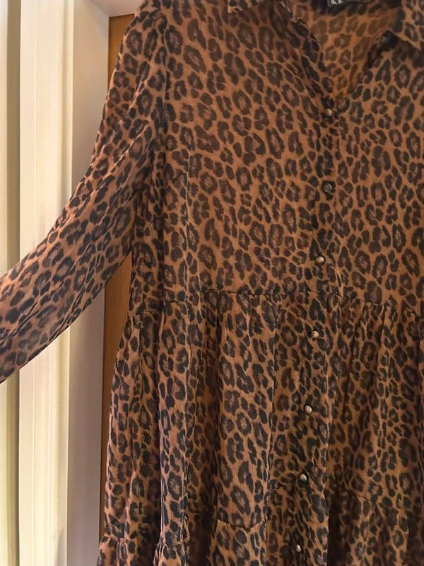 View Vinted's returns policyThis New Look leopard print smock dress features a bold animal print and a relaxed fit. The long sleeves and button-front add to its casual charm. Perfect for a statement piece in your wardrobe.
