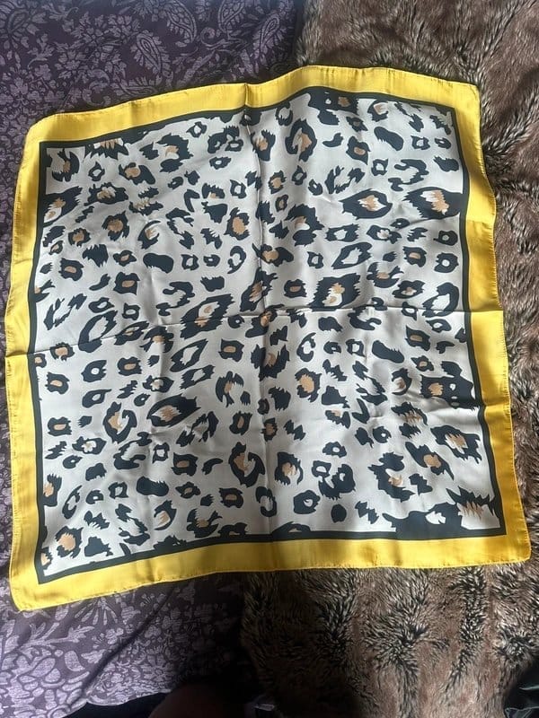 This New Look scarf features a leopard print design in mustard and beige with a yellow border. Made from silk-feeling fabric, it adds a touch of wild elegance to any outfit.