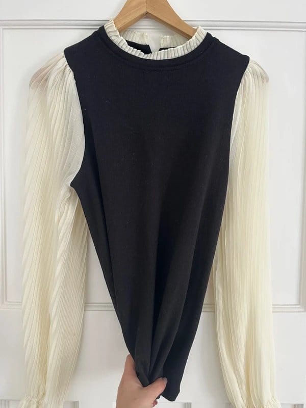 Stylish New Look top featuring a black body with cream chiffon sleeves. Perfect for office wear with its elegant and professional look.